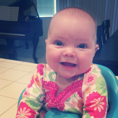| 5 months - so precious! The day of Auntie and Uncle's wedding, we were folding napkins and apparently Geneva thought it was the most boring thing ever. ;] |